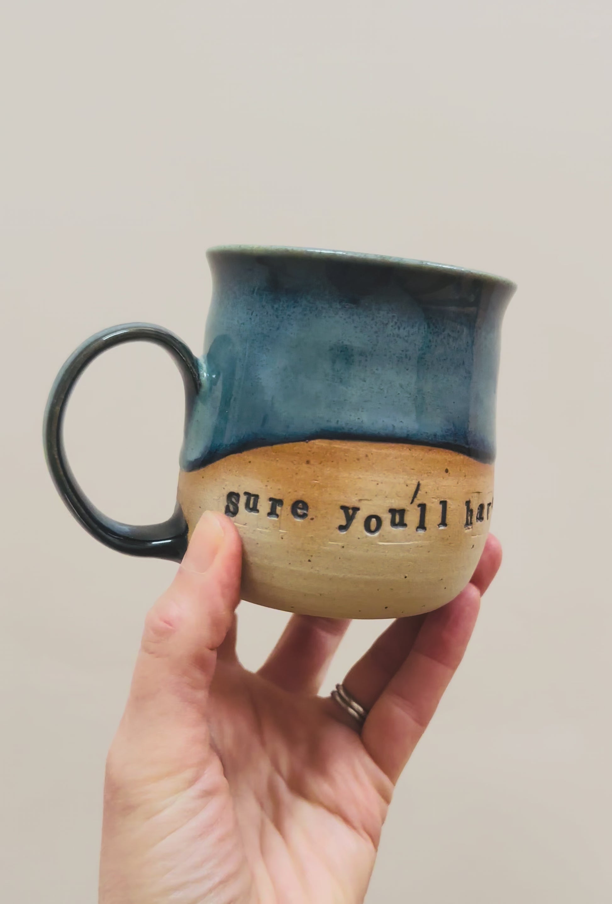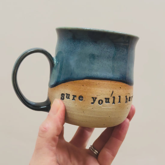 I first throw these mugs with a toasty tan stoneware clay. They are then trimmed, handles attached and the writing embossed before being slowly dried and bisque fired. I then glaze them with 6 different coats of glazing and fire them again to 1220°C.