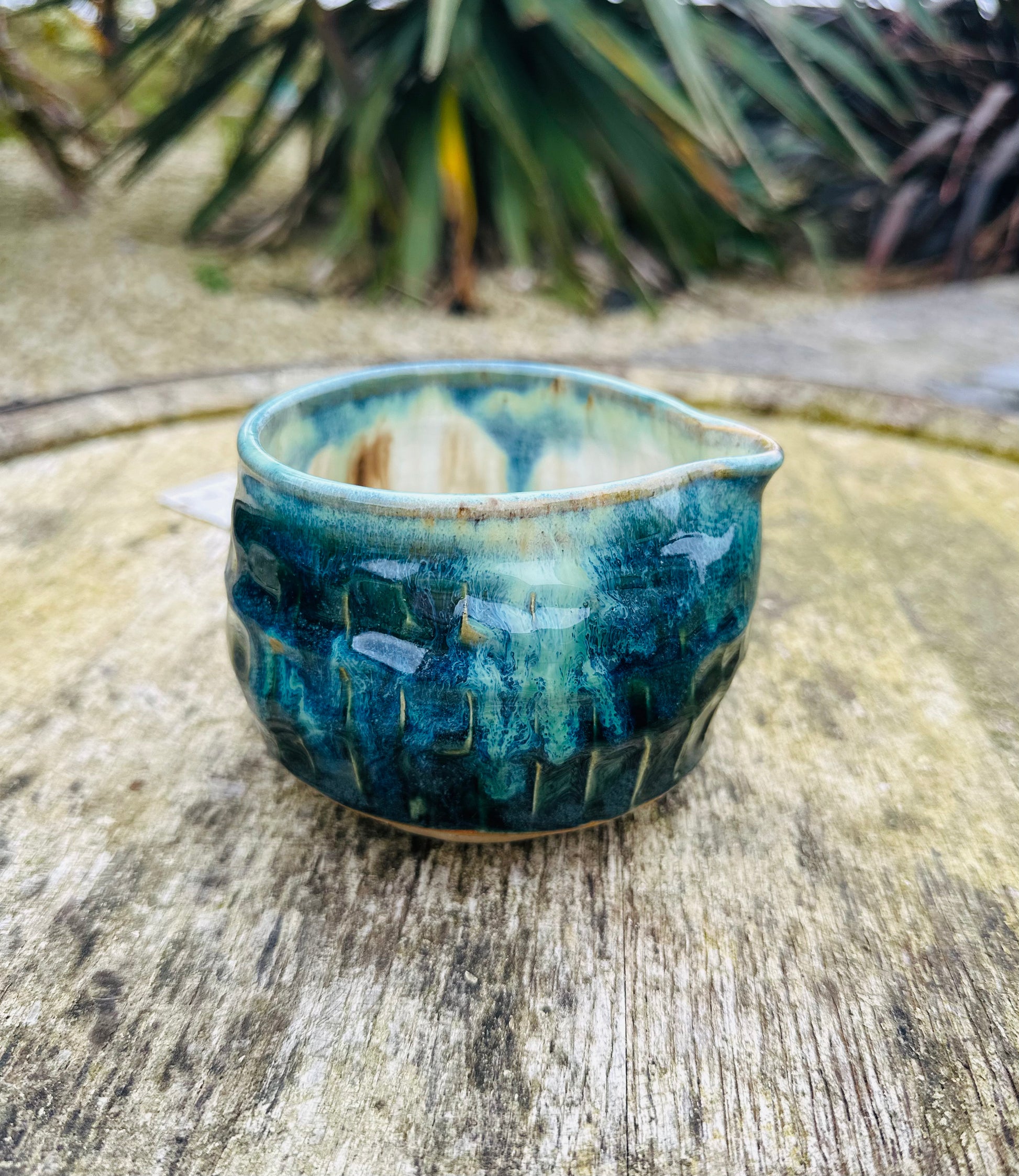 My Matcha bowls are made from tan stoneware. They were thrown on my potters wheel before being trimmed, shaped and slowly dried before being bisque fired, hand painted and refired to 1220°C. The inside is a gorgeous cream speckle colour while the outer is a mix of blue and green hues.